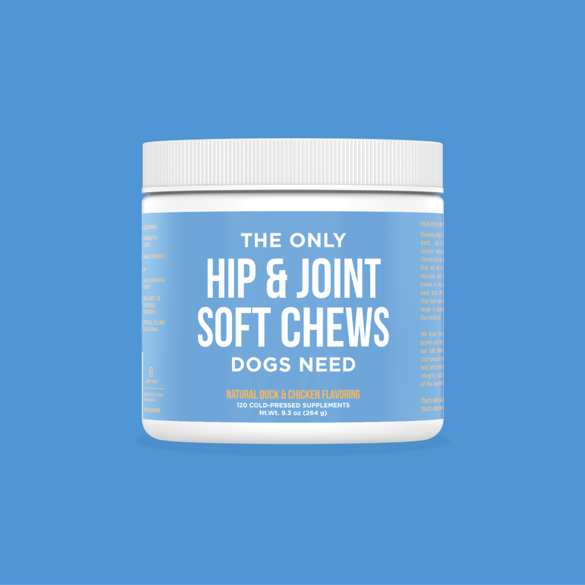 Sleeping dogs lie, but we all know hips don’t. Our Hip & Joint Soft Chews contain ingredients like glucosamine, chondroitin sulfate, turmeric, and MSM that are not only shown to support & maintain joint health; but are also known to help reduce inflammation & ease pain. Most importantly though, they help improve your pup’s ability to repair & strengthen joint tissues from the inside out.