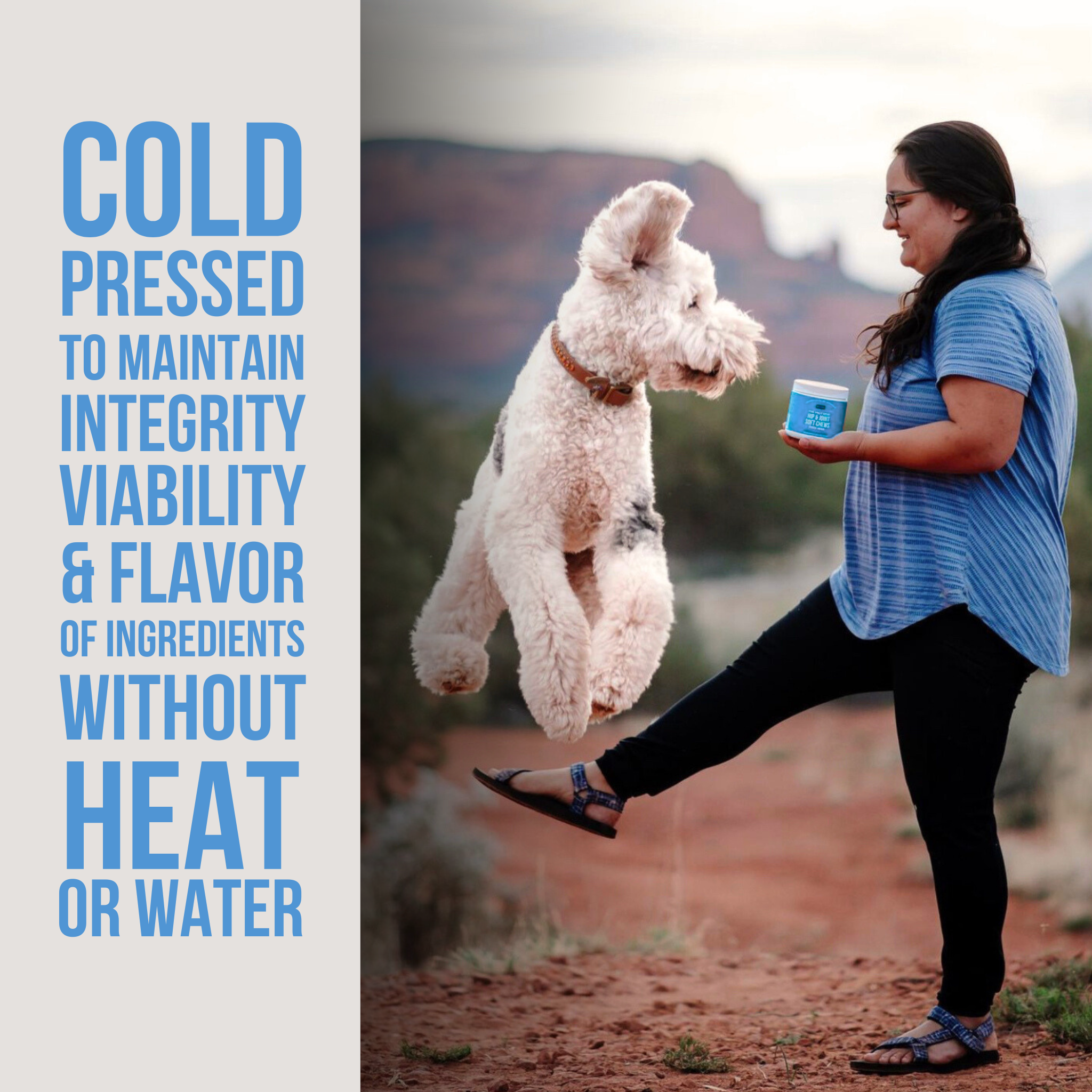 What truly makes our soft chews different is this: Our cold-pressed process does not use any heat or water, which allows us to maintain the full integrity, viability and flavor profile of all the ingredients.